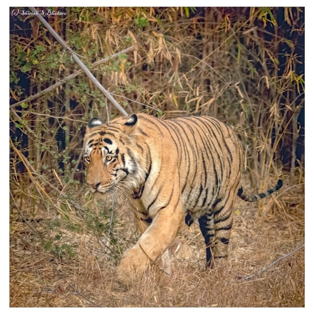 He is known to be a very active tiger who walks over over 20 to 25 km in just one night. He fiercely guards, his territory from other rogue males and ensures his Cubs thrive well. Few months ago, he was seen defending his territory from a rouge male call Bamboo Walla. This male is younger to CM, but almost equal in size. He hails from the territorial forest and seen frequently during night, safaris in the Navegaon buffer area. For now CM has subjugated this new male and continues to dominate the Navegaon offers.