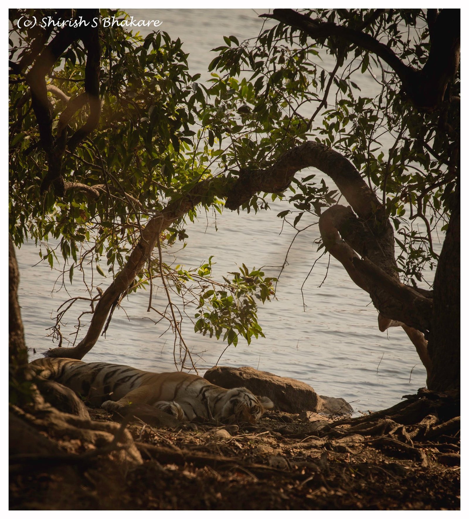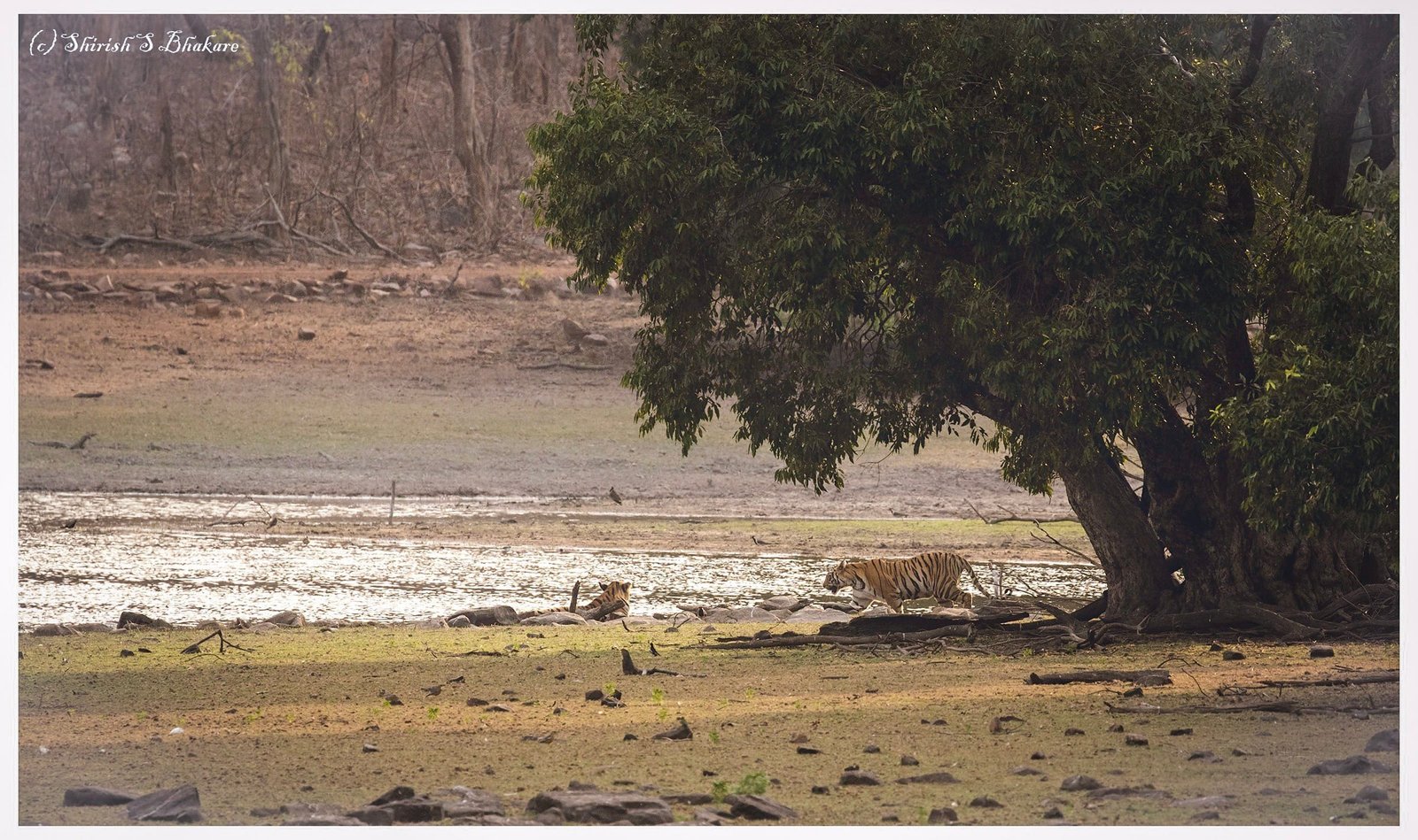 Maya sat in lake with one of the cubs. The herbivores relaxed, came out and continued grazing. A mating pair of spotted deer was fun to watch. The stag was pursuing the female. The courting went on for hours. She was resisting his move and everytime he chased she ran in direction of Maya. I expected some action. But nothing happened. Suddenly there was roar from the far end of lake. Maya, her cub, herbivores and myself looked at same direction. It was some tiger on far side. It was Maya's mate Matkasur. He was unseen for few days and was seen heading none-tourism area. He was relaxing next to the kill with his tummy filled.
