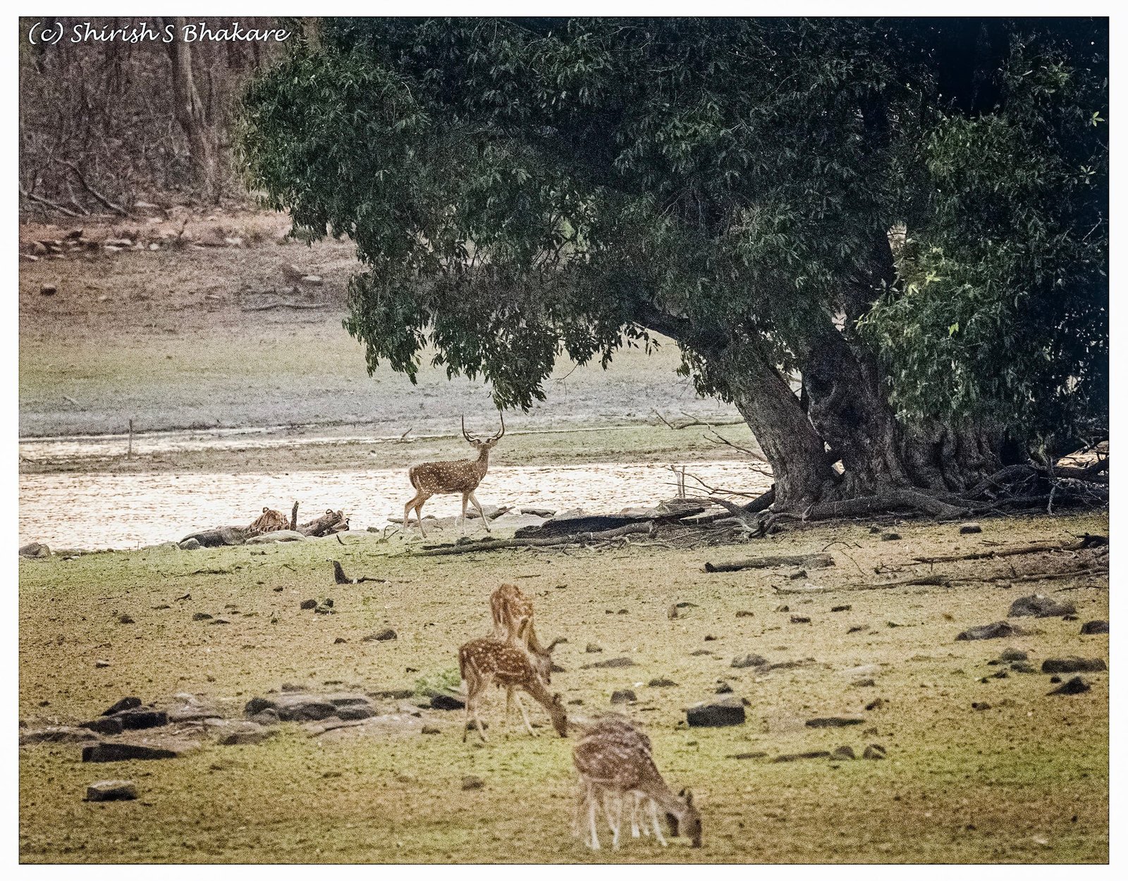 Hundreds of spotted deer, sambar deer, peacocks and wild boars enjoyed and grazed along the bank. Some sambar deer even dared to enter water and eat the grass. No one was scared of proximity of tiger cubs. Suddenly the queen of Tadoba lake, Maya entered frame few metres away from grazers sending them into panic. All herbivores fled in dense to hide.