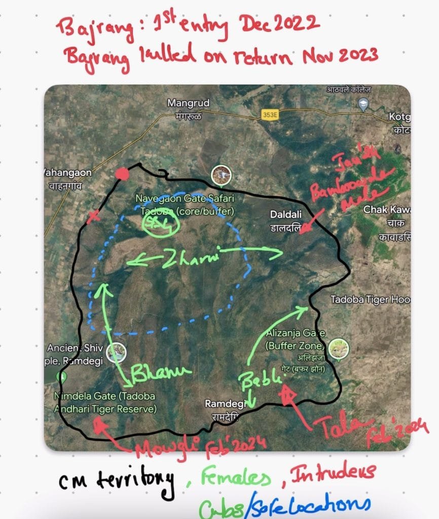 It was in his absence when Tala and Mowgli tried to make in-roads. Tala, brother of Rudra, is part of tag team who outsed Matkasur from core few years ago. However neither could hold on to core territory and Tala became a nomad. Tala on his nomadic excursion entered CM area and believed to have engaged in skirmish with CM before injuring recovering CM and leaving buffer. This was in Feb 2024. Unconfirmed rumours of Tala moving in again come from Jogamoga/Daldali area and skirmish with Zharni is evident from puncture wounds of Zharni. Zharni is veteran and pushed Tala back and moved her cubs to the ravines of Ramdegi in Chimur hills. Second threat to Zharni and her cubs comes from Bamboowala as his territory is in close proximity to Zharni area. Daldali area becomes the area of contention. Hopefully we will know more about Bamboowala male once the Shedgaon safaris become operational.