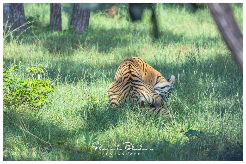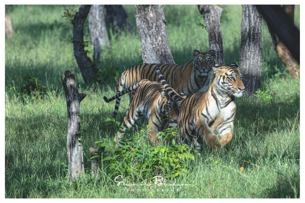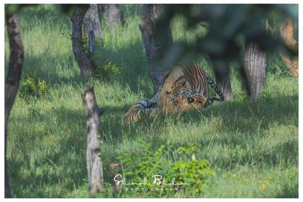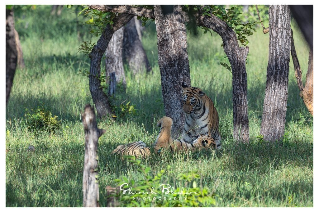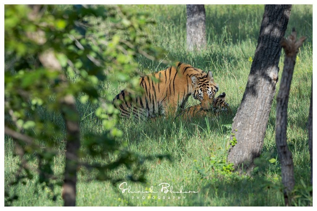 Tiger cubs are born after gestation period of 3 months. They have no vision for first 2 weeks of life. They are weak and can’t even walk properly for 1st month. They are completly defenceless for first few months of life and dependent on mother. The mother will keep the cubs hidden as much as possible since these tiny tots are easy pickings for birds of prey and other animals including tigers. Mumma tigress keeps moving the cubs from den to den, in-order to protect them so that scent of cubs doesn’t attract unwanted attention. As cubs grow older they gain size and stability in gait. Generally, this is time we get glimpses of the cubs for first time as they start following the mother.